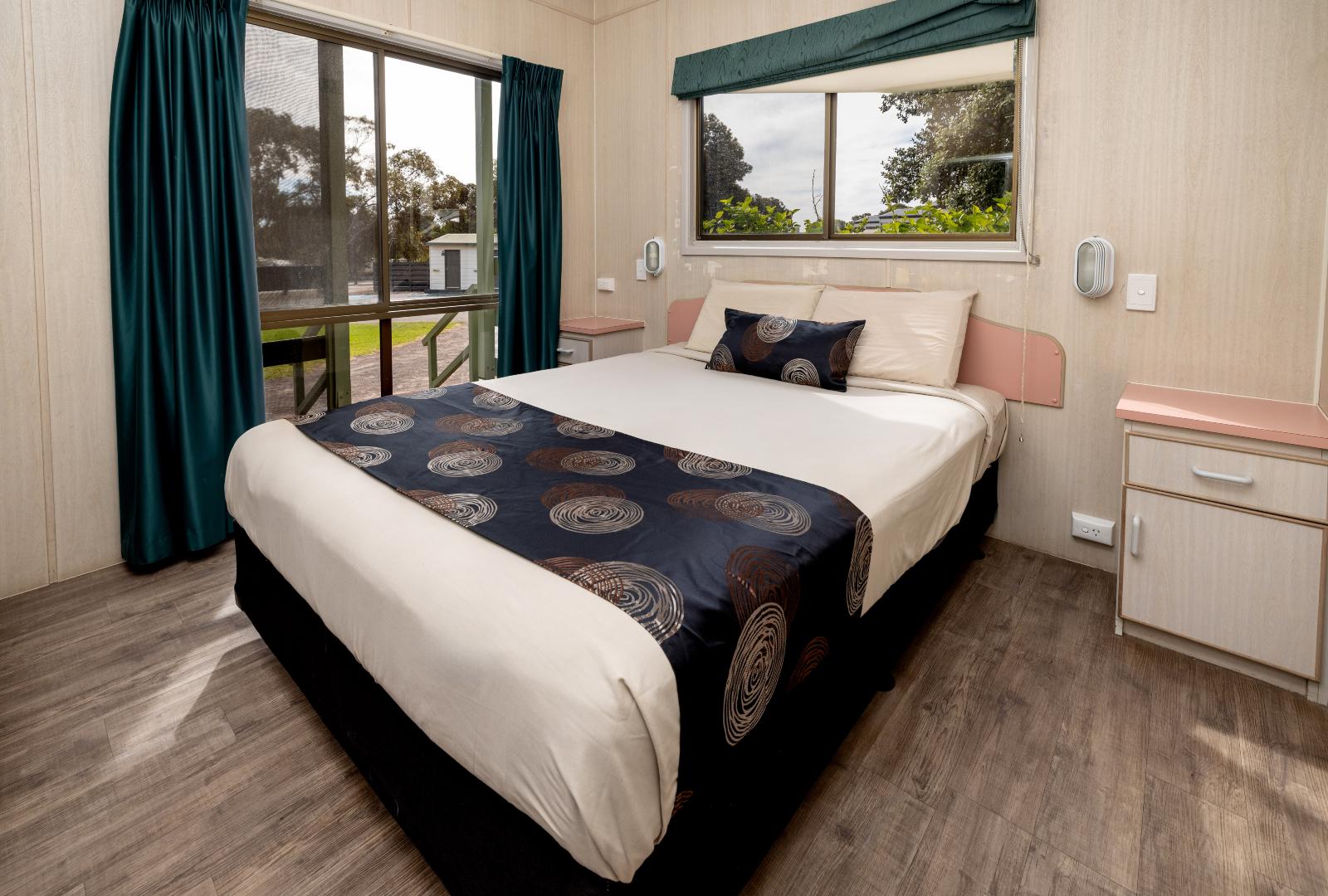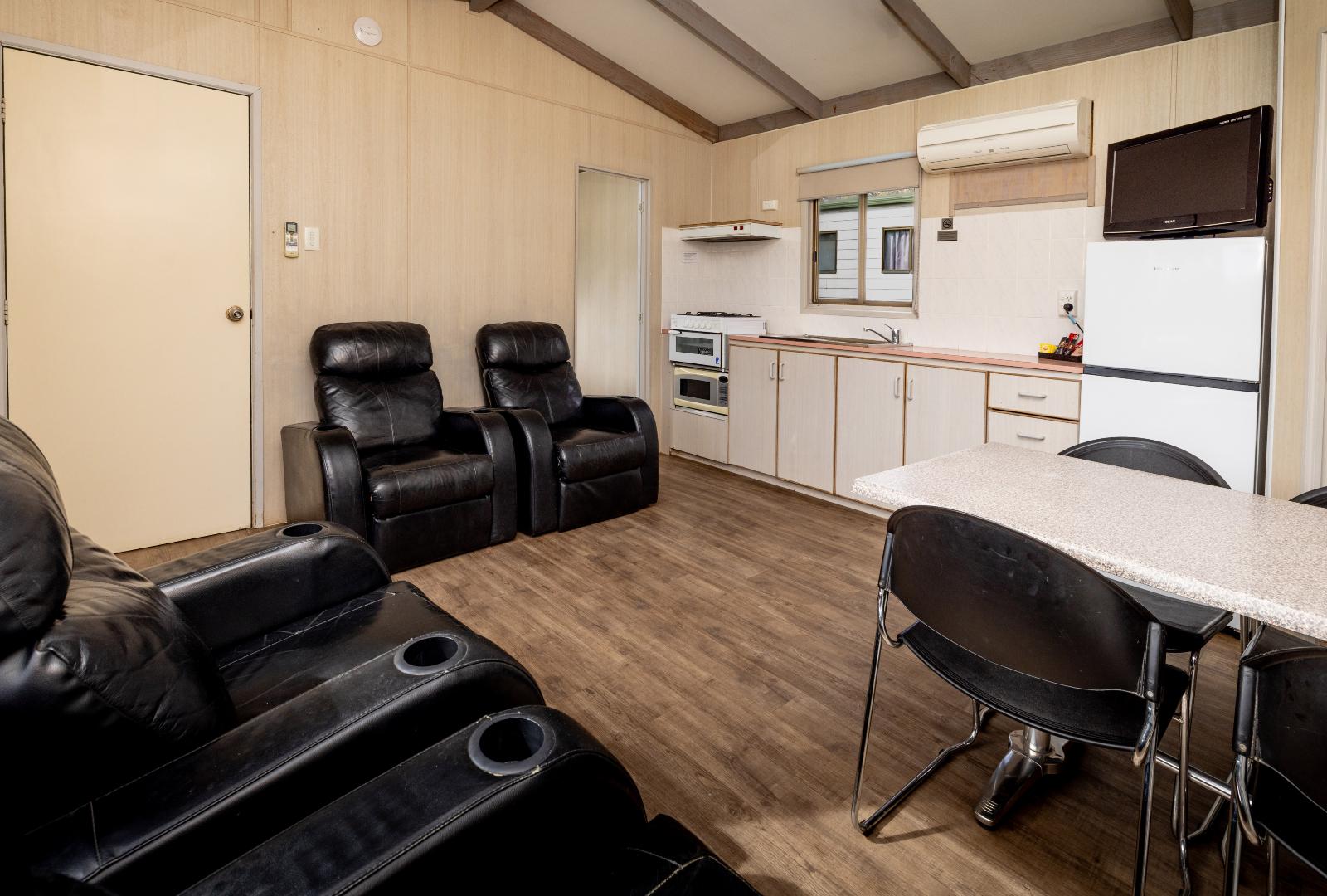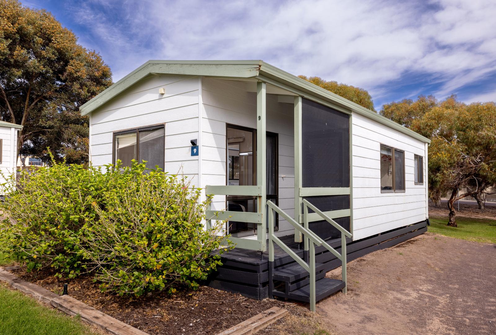 Just right for four, our Holiday Unit is perfect for your beachside getaway! This budget-friendly, older-style cabins offer a queen bed in the main bedroom and two single beds in the second bedroom. The cabin has a kitchenette including fridge, microwave, stove top, plenty of crockery and cutlery with a separate dining area and TV. The bathroom in the cabin includes a shower, toilet and vanity. The cabin is air-conditioned for your comfort. We have select dog-friendly options available. Please notify us if you are bringing a dog. Additional charges apply. Please note this is a budget-friendly cabin. So while you’re saving on luxe accommodation, there’ll be more to spend on creating memories through exploring captivating surroundings and savouring delightful dining experiences. Enjoy the perfect balance between a relaxing holiday and thrilling, all while keeping your budget in check. *Please note the surroundings of the villa are not always as pictured.