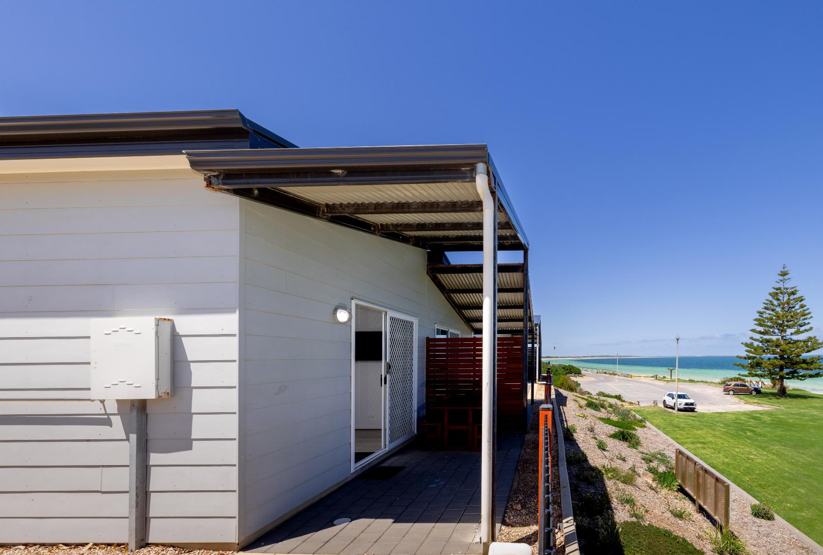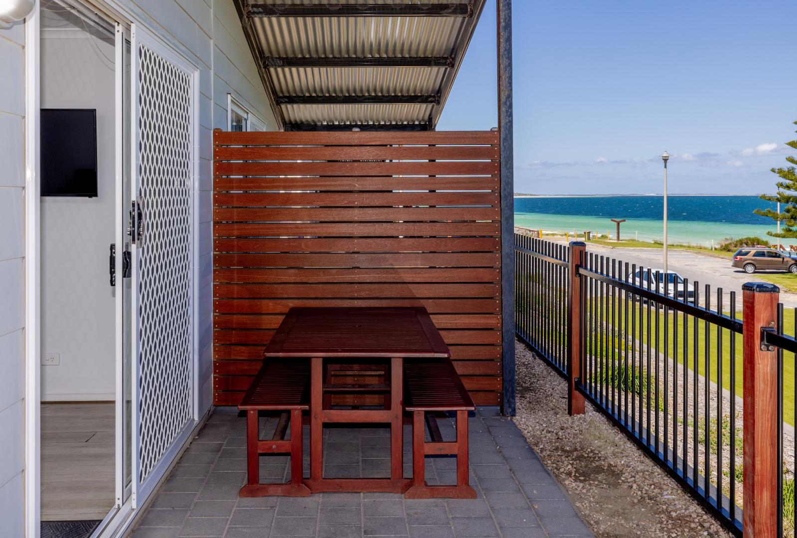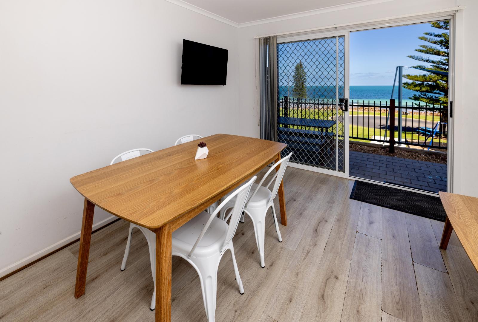 Enjoy stunning views of Port Hughes Beach from the comfort of your unit. Overlooking the Port Hughes Pier, our ocean view units are fantastic for those that love the sound of the ocean and the sea breeze. These spacious units sleep up to 5 people, featuring a queen bed in the main bedroom and 1 single bed and 1 set of bunk beds in the second bedroom, making them ideal for families and groups. With a modern and fully equipped kitchen, you’ll be able to whip up dinner with no hassle at all. There’s plenty of space to enjoy meals together as well, whether it’s inside using the dining room or out on the patio on the outdoor setting. The cabin is equipped with HD TV, High-Speed Internet, and streaming services, ensuring entertainment and connectivity during your stay. We have select dog-friendly cabin options available. Please notify us if you are bringing a dog. Additional charges apply. *Please note the surroundings of the villa are not always as pictured.